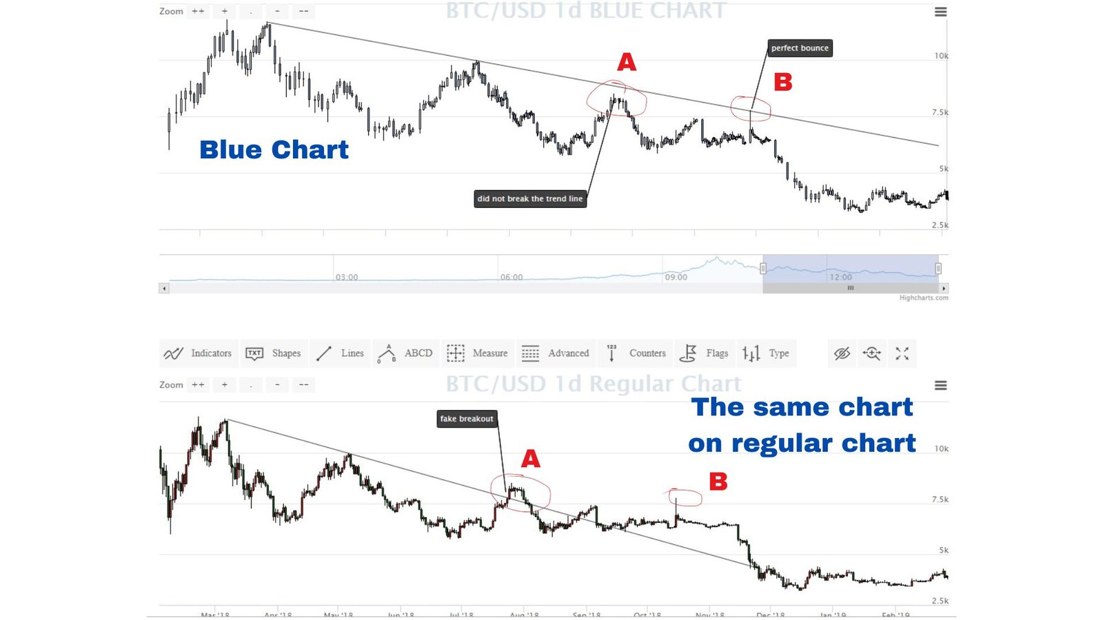 or trend line resistance signals on Blue Bitcoin Charts is much more accurate compared to trend analysis on traditional charts (See example - Fig.1).